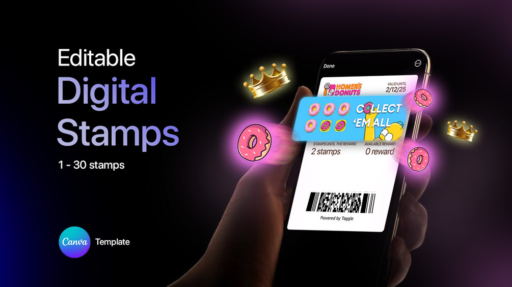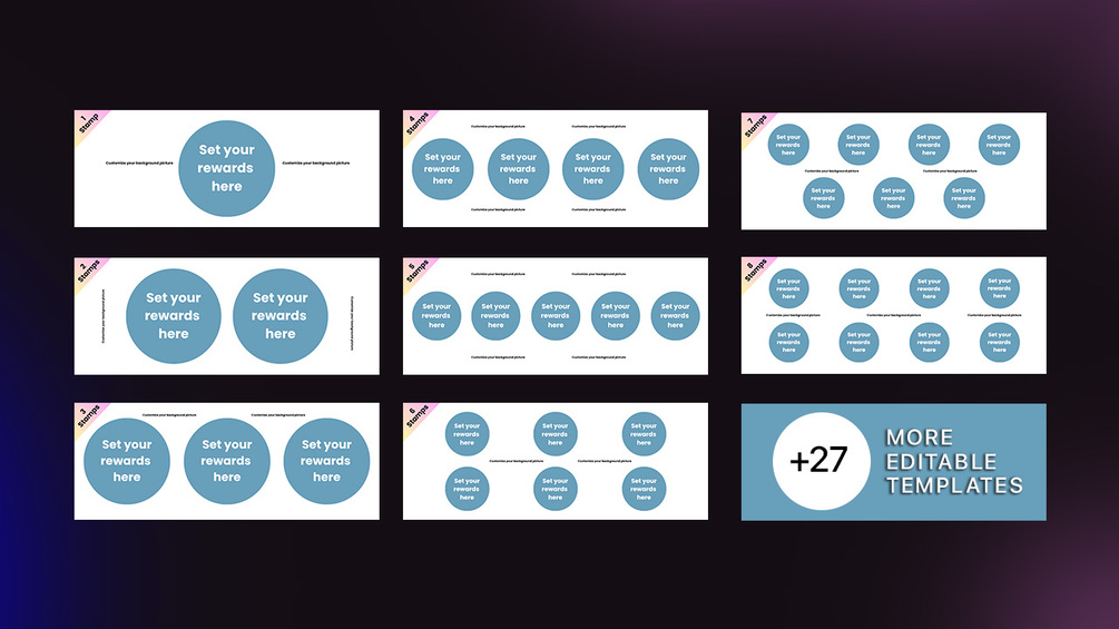 This template pack gives you a complete 30 stamp card layouts (from 1 to 30 stamps) β all 100% editable in Canva and sized perfectly for Digital Loyalty Cards (1125x432px)